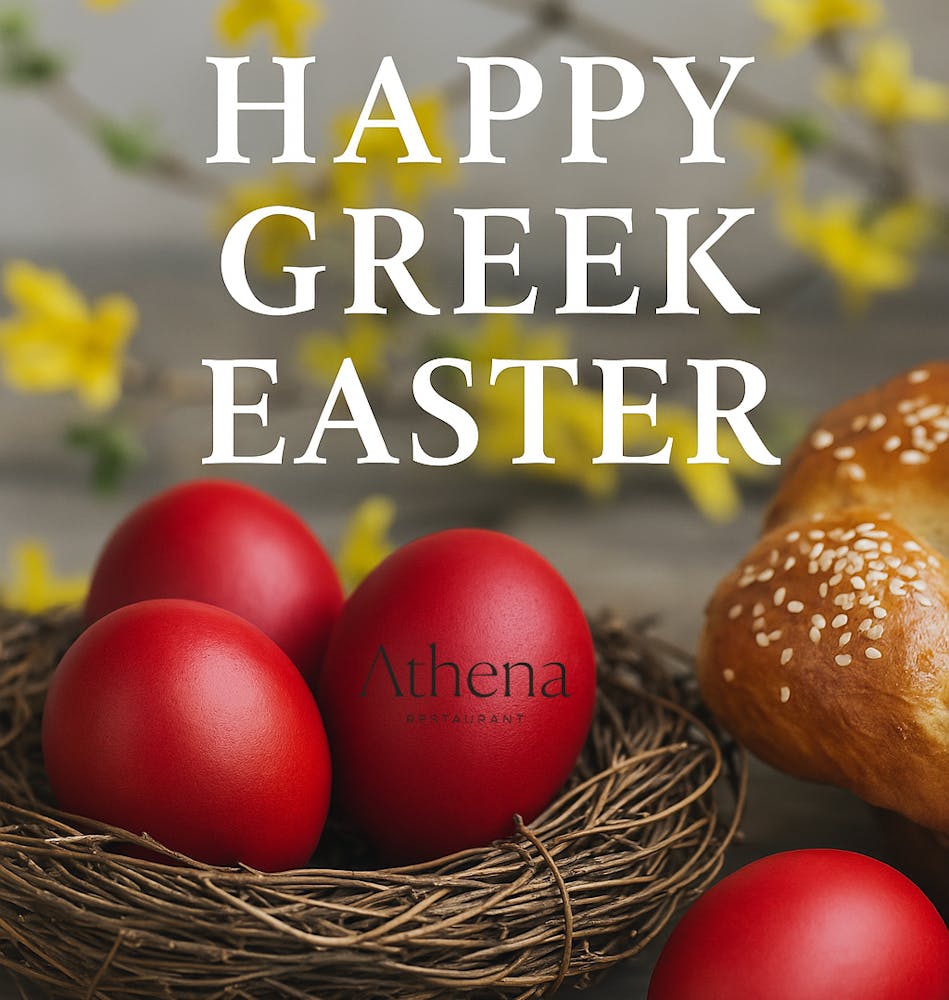 Join us on Saturday, April 20th, as we honor one of Greece’s most cherished holidays with a special Easter celebration at Athena. Our festive menu will feature traditional favorites including Pashalini Salad, Magiritsa Soup, and our signature bone-in roasted lamb—slow-roasted to perfection and full of authentic Greek flavor. Gather with family and friends and experience the warmth, tradition, and hospitality of a true Greek Easter. Call to make your reservation now!
